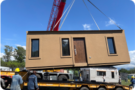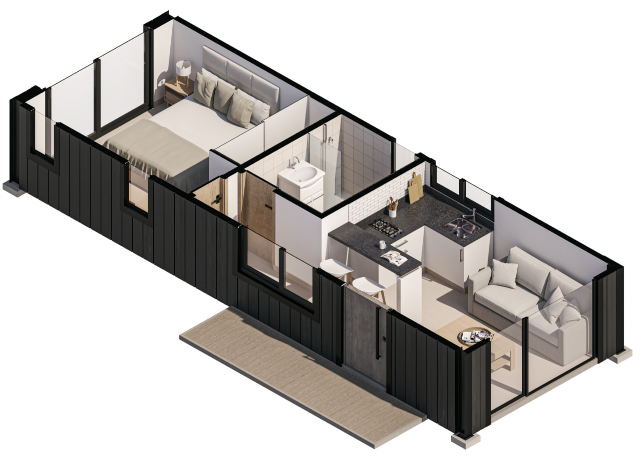 Cuenta con un dormitorio, un baño completo y una kitchenette-comedor integrada que maximiza el uso del espacio sin resignar comodidad. Su diseño eficiente y su sistema constructivo permiten una rápida ejecución y una adaptación flexible a distintos usos y entornos.