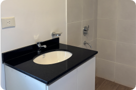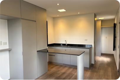 Incluimos mesada con bacha y muebles en cocina, griferías, artefactos de baño, placard en dormitorio, termotanque e instalaciones embutidas.