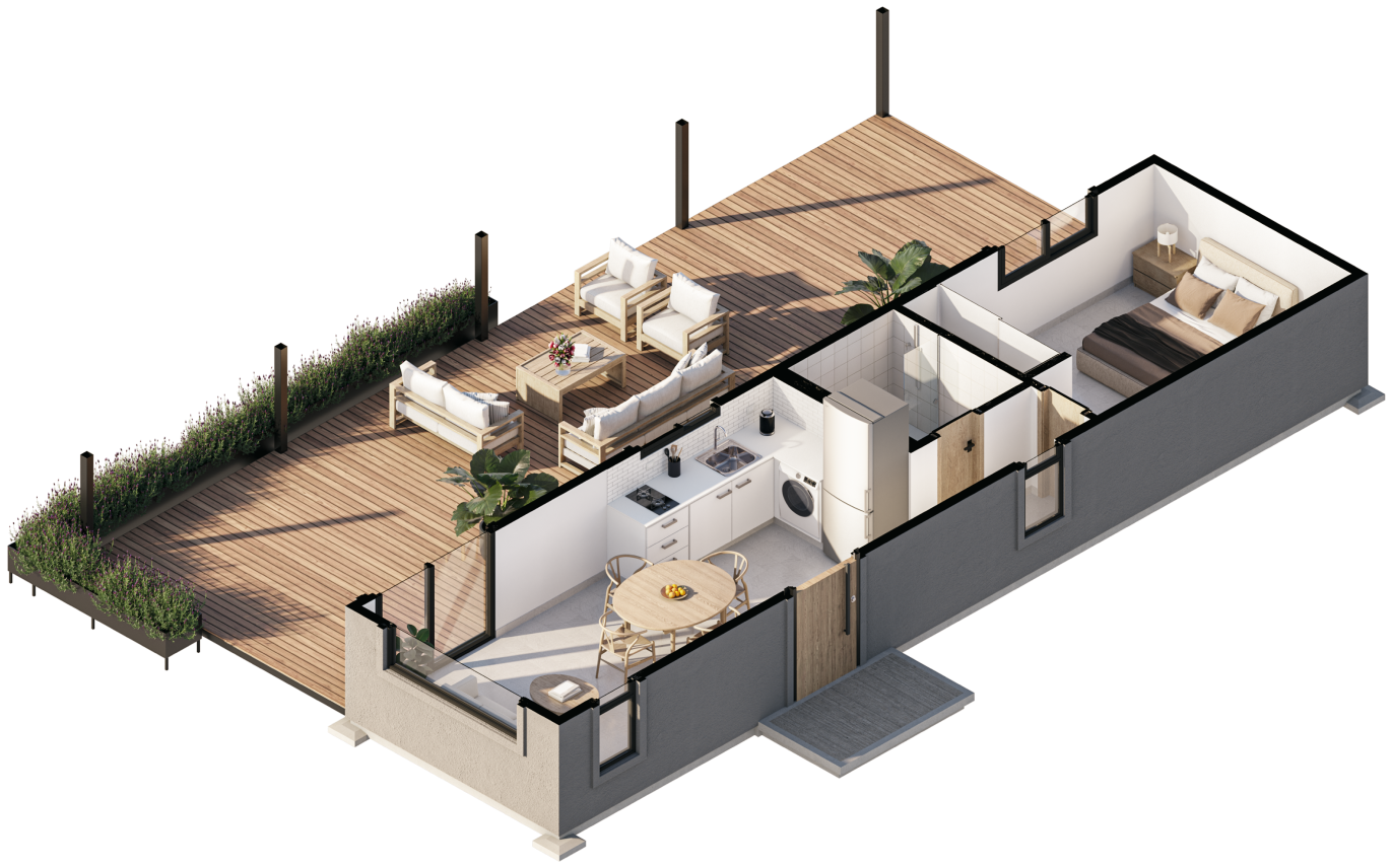 Dispone de un dormitorio, un baño completo y una cocina-comedor integrada que acompaña la vida diaria y los encuentros en familia. Su sistema constructivo en Steel Framing garantiza una estructura durable, eficiente y adaptable a distintos contextos y estilos de vida.